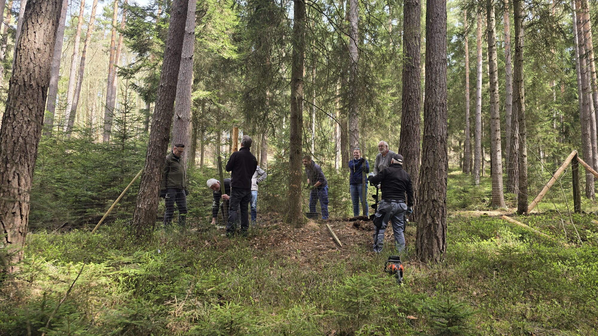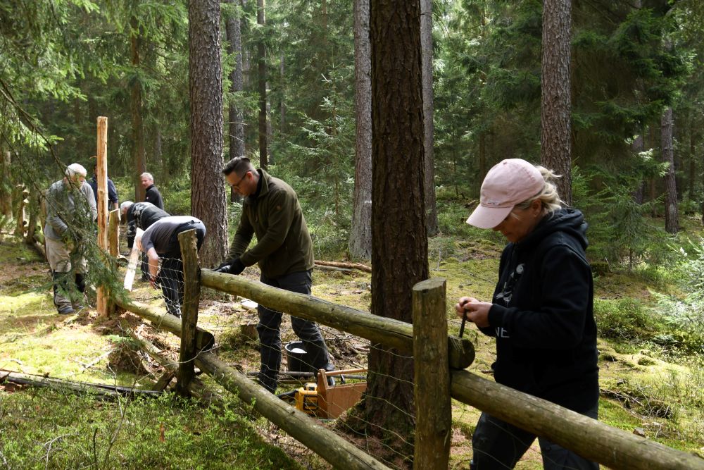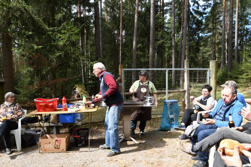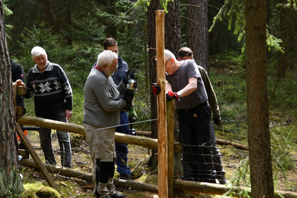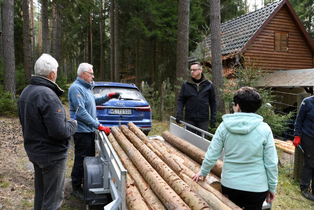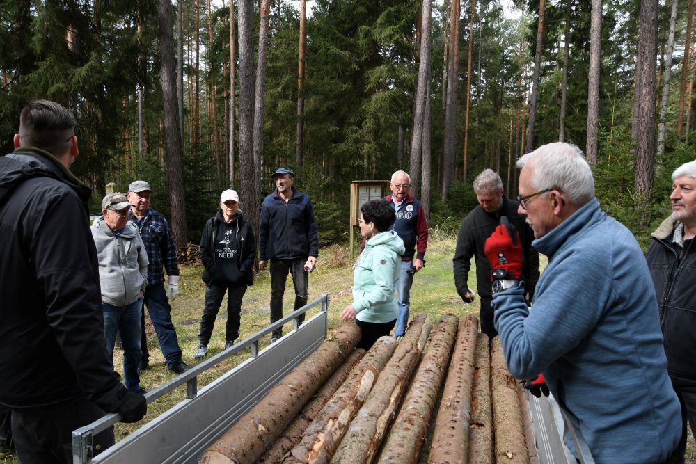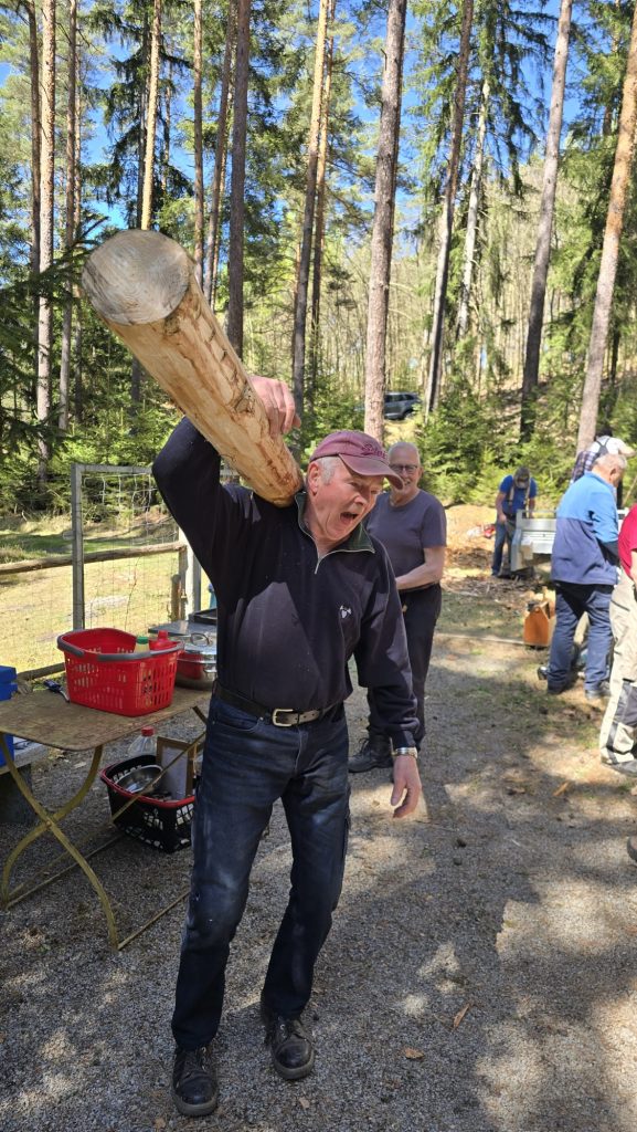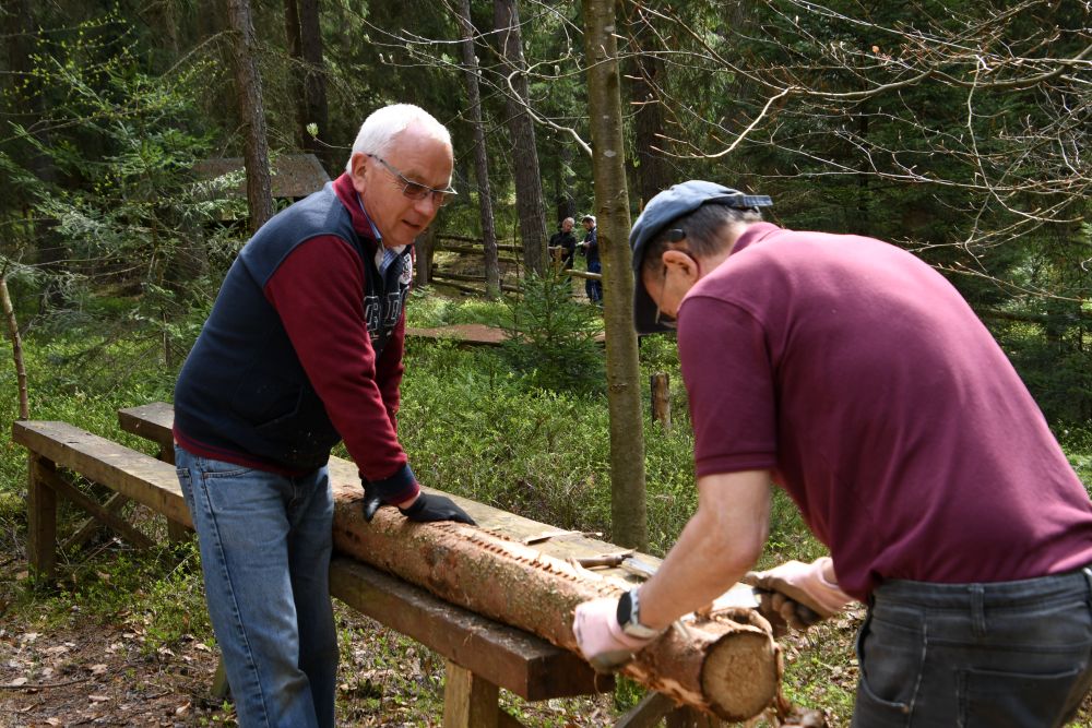 Dieser Arbeitseinsatz war vor allem durch die Erneuerung der Umfriedung, welche nun schon etwas in die Jahre gekommen war, geprägt. Insgesamt trafen sich 20 fleißige Mitglieder unseres Vereins. Durch den Thüringen Forst wurde uns das Baumaterial zu Verfügung gestellt. Nach dem Schälen der Rinde konnten die Stämme entweder als Zaunpfosten oder als vertikaler Zaunbestandteil eingebaut werden.